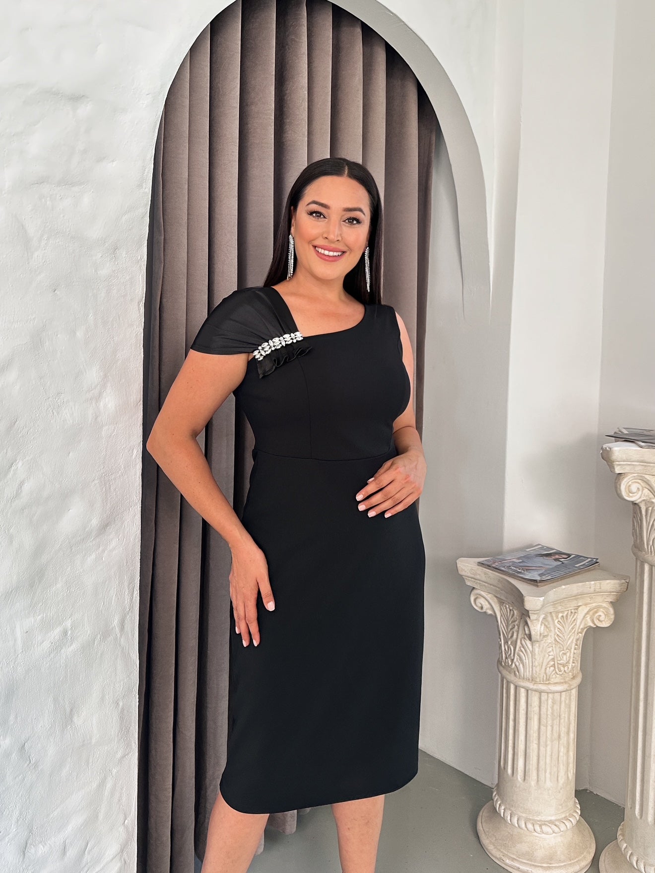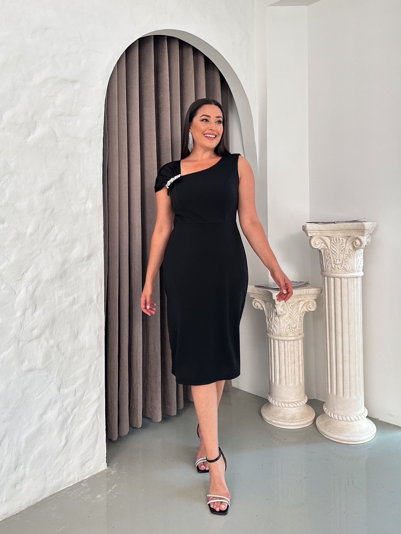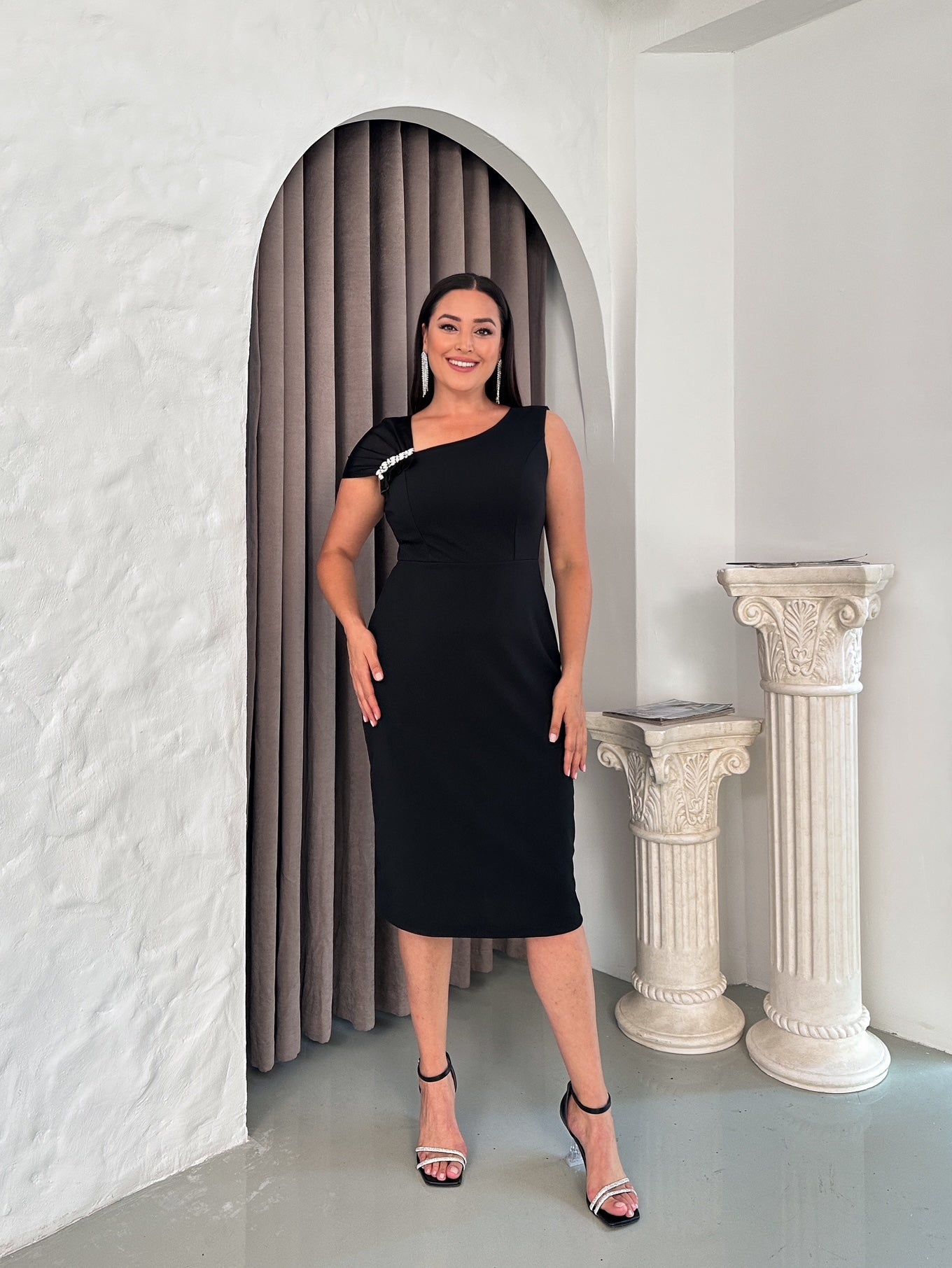Omzu Saten Taşlı Abiye Elbise
