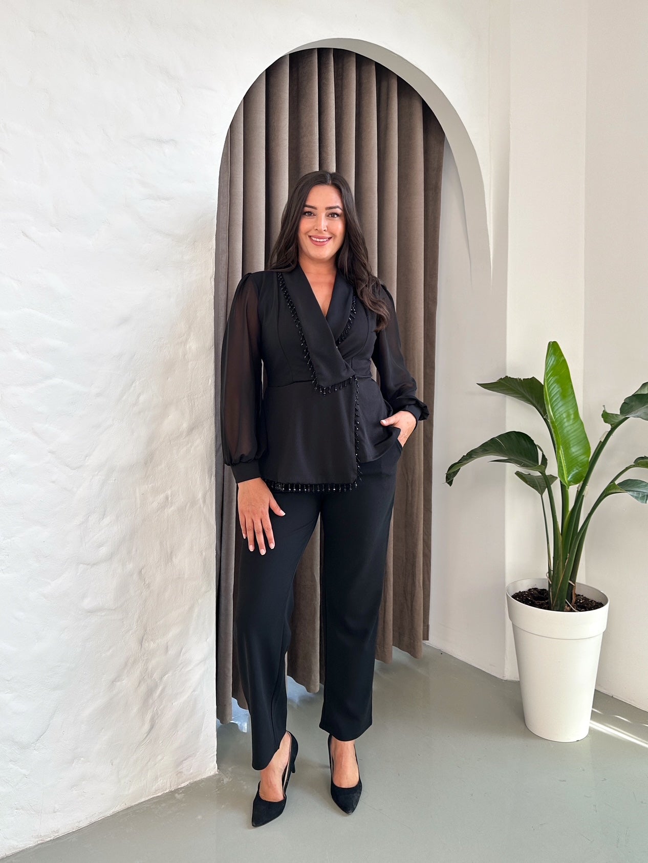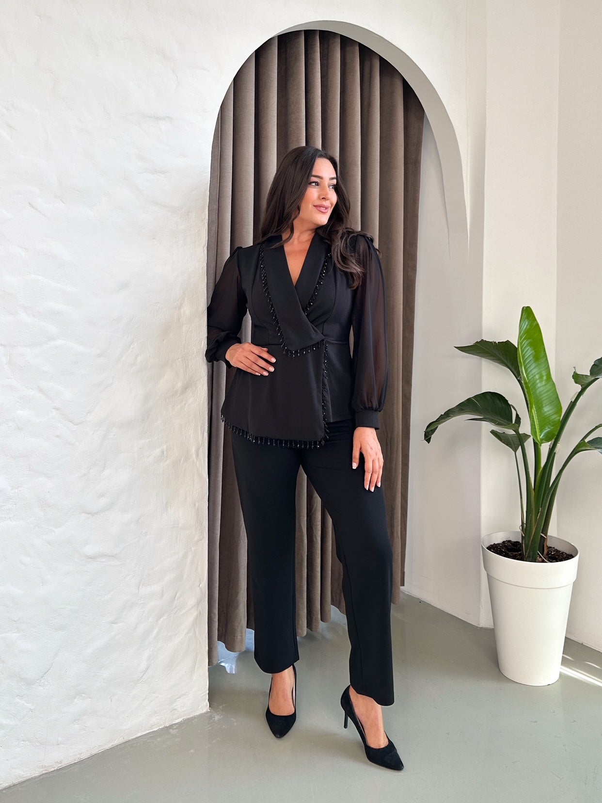 Uzun Kollu Taşlı Abiye Takım