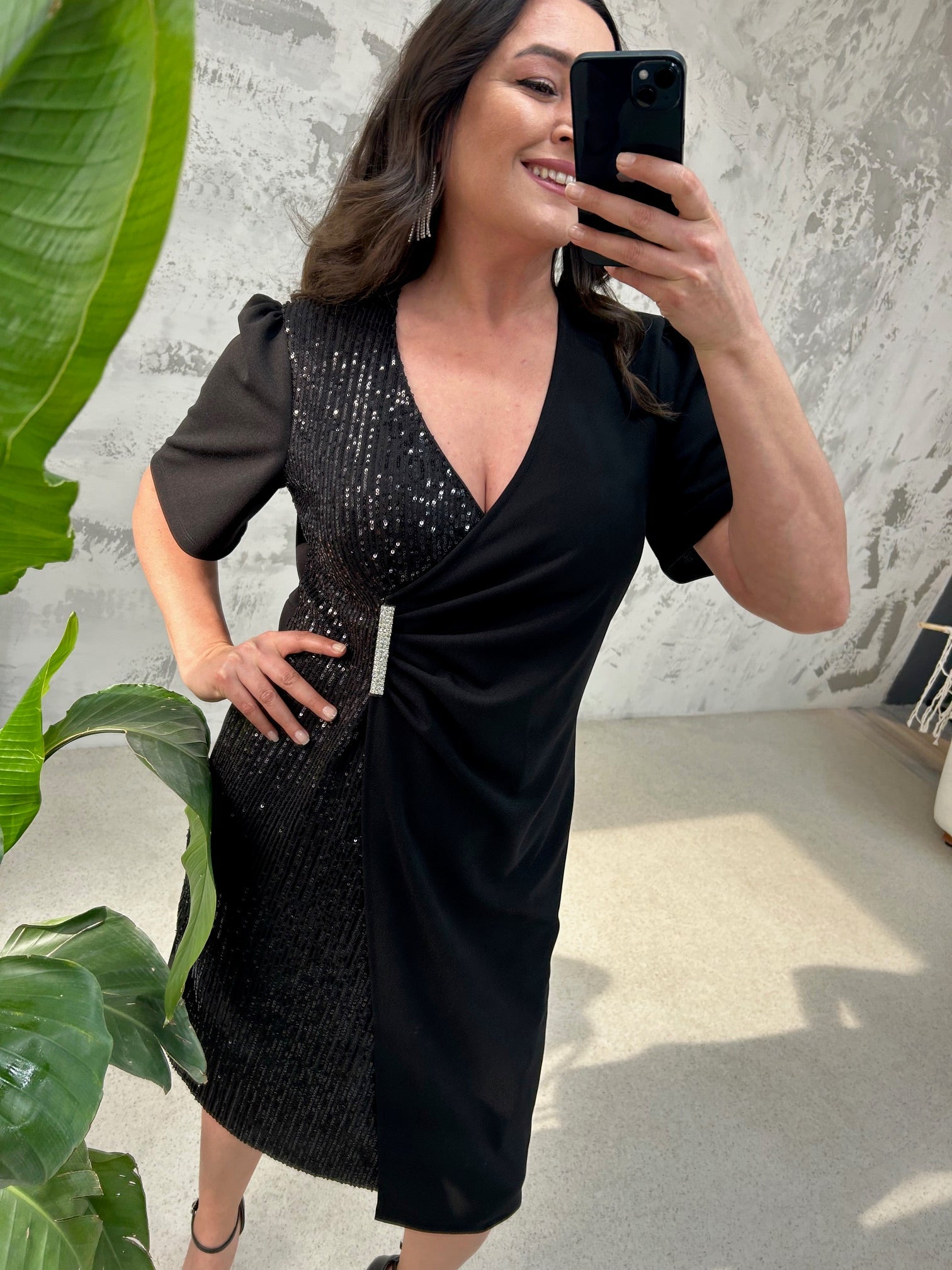 Yandan Payetli Taş Broş Detaylı Abiye Elbise